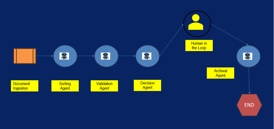 In insurance, AI agents automate the review of claims documents by cross-verifying key information and identifying potentially fraudulent applications. Documents are accurately classified, checked for completeness, and either approved manually by a human or automatically by an authorized signing agent. Comprehensive audit logs and archival agents ensure traceability and safeguard data integrity throughout the process.