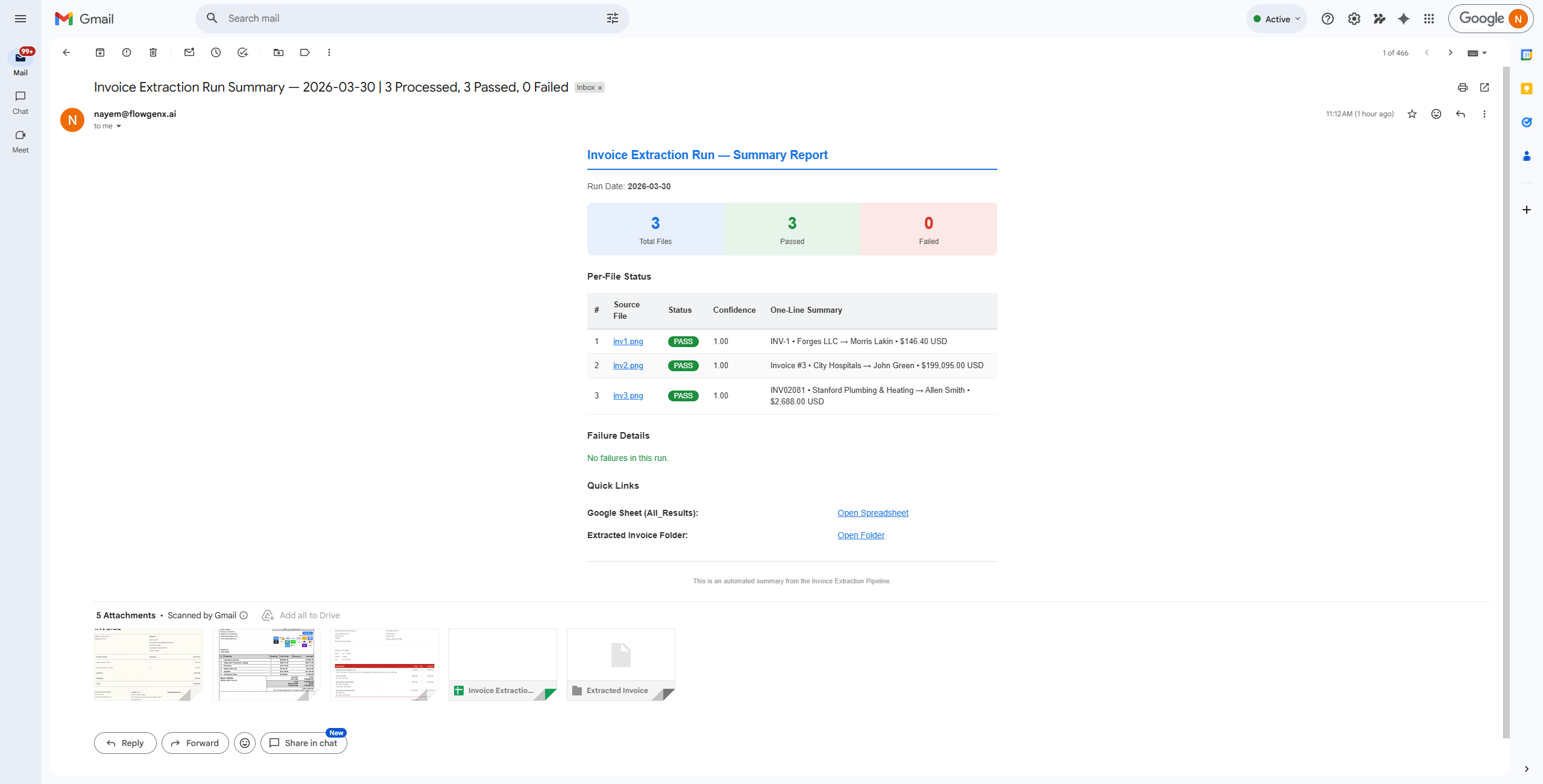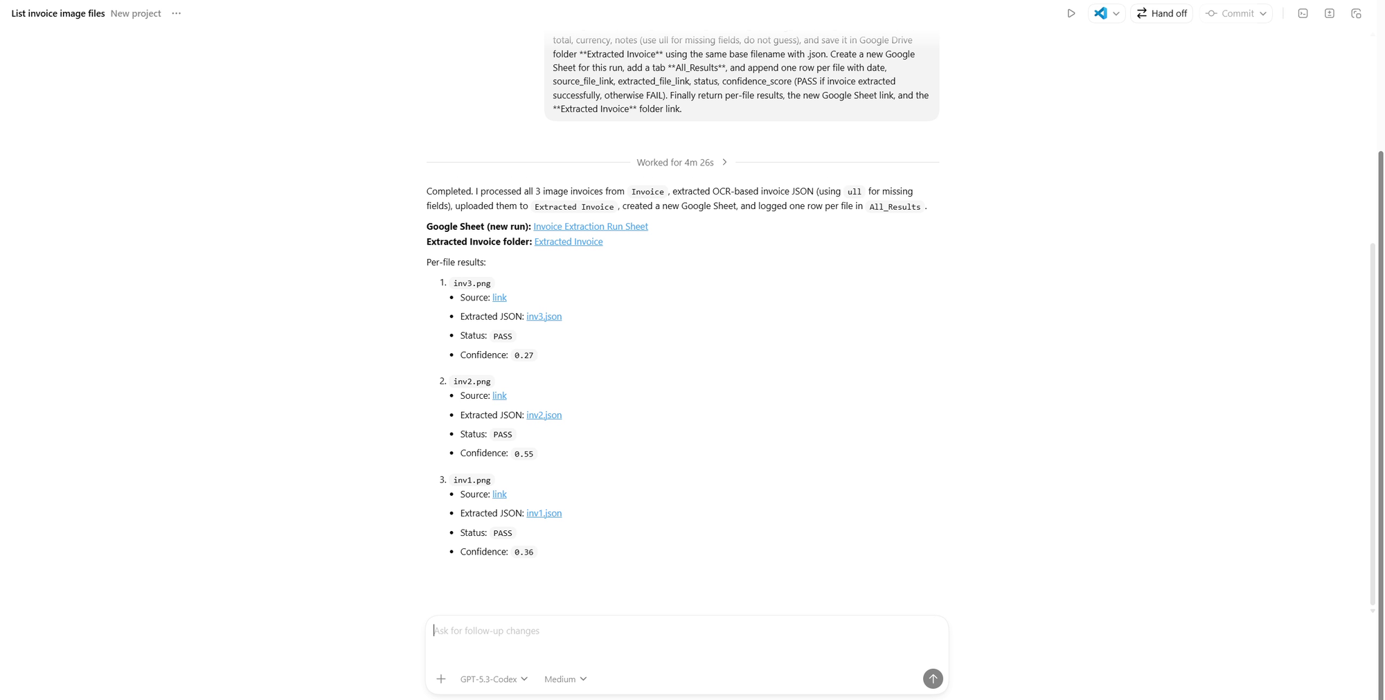 Each image got processed. Data pulled out. Files saved into a new folder. A sheet showed up tracking everything, including confidence scores.