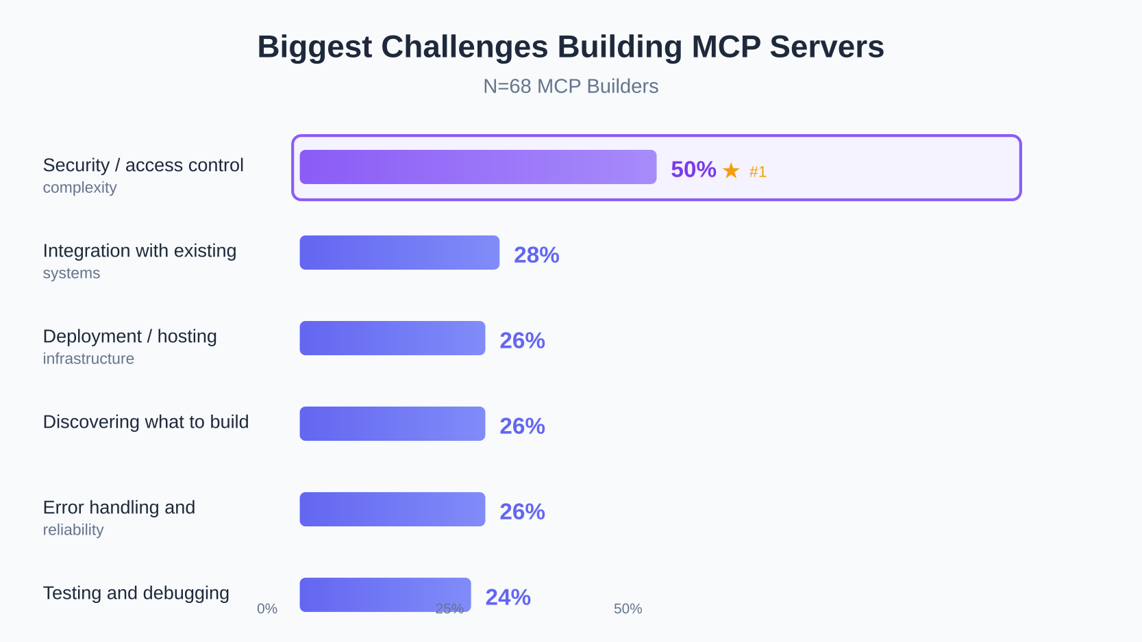 Security dominates the list—50% of builders struggle with access control complexity. Integration (28%) and deployment (26%) follow, but security remains the #1 blocker.